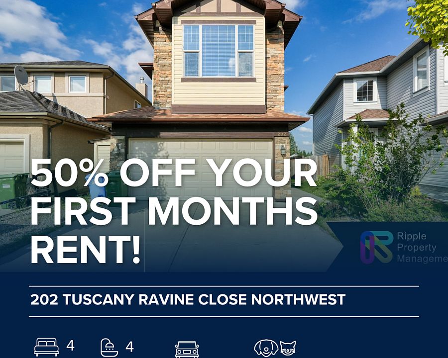 Modern 4 Beds, 4 Baths Single- Family | No Pets Allowed Welcome to your new home at 202 Tuscany Ravine Close Northwest - N/A a modern and well-maintained 4 beds / 4 baths / offering comfort, space, and convenience. Ideally located close to shopping, schools, parks, and transit. SHOWINGS: Conducted in an open-house format book your appointment today! Prices, availability, and promotions are subject to change without notice. PROPERTY DETAILS: - Furnished or Unfurnished: unfurnished - Pets: No Pets Allowed - Smoking: Non- Smoking - Parking: Double Garage Attached - Storage Included: No - Laundry: In- Suite Laundry - Management Type: Full Management - Lease Term: Long Term UNIT FEATURES: - Living Space:Open-concept living room layout, perfect for relaxing or entertaining - Kitchen: Sleek and modern kitchen with all appliances for a contemporary look with plenty cabinet storage to keep everything organized - Dining Space: Open-concept design flowing into the living space, perfect for entertaining - Bedrooms: 4 Bedrooms featuring ample storage for clothing and accessories - Window Coverings: Includes window coverings for privacy and light control UTILITIES: - Utilities Included: No Utilities Included Here's a helpful tool you can use to get a rough estimate of utility costs. LOCATION HIGHLIGHTS: - Outdoor Living: Nearby Parks, Pathways, Greenspaces - Transit & Access: Transit Lines / Major Roads Nearby - Family Friendly: Close to Schools, Childcare, Rec Centres - Local Conveniences: Groceries, Shops, Restaurants, Services Nearby Don't wait properties like this don't last long.
