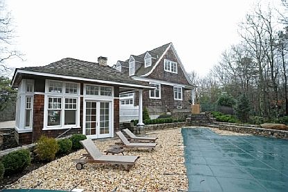 Custom-built of the highest quality materials inside and out, this 6,000+/- sq. ft. California-style cedar and stone traditional home sits majestically atop one the highest points in East Hampton on Two Holes of Water Road. Designed by architect Ken Davies and cohesively finished in 2012, this very special home features a full radiant heat system, polished limestone, marble & high-end tile, quarter-sewn oak floors, coffered ceilings, moulding and over 2,000 +/- sq. ft. of Brazilian 'Epi' hardwood exterior decking surrounding the house on all levels. The first floor features a grand entry foyer with open library art gallery space and wood-burning fireplace, four separate guest suites of which two are connected to a private sitting/media room with stone fireplace, powder room and laundry. The second level is dominated by the stunning main living area which includes the gracious kitchen and open dining along with a beautiful master suite, separate powder room and French doors leading out to various decks suitable for entertaining and lounging. From there, travel up the spiral staircase to the third story roof deck with dramatic year-round views of the Atlantic Ocean & Georgica Pond. The spacious sixth bedroom suite sits above the heated three-car garage, and is easily suitable as quarters for additional guests or staff. To top off the interior, the finished lower level boasts a 1,200+/- sq. ft. screening room perfectly befitting of a private movie premiere. Exterior amenities include a 570 sq. ft. heated gunite pool, separate spa and pool house with half bath, heat and stone floors. With over a five million dollar replacement value, this especially unique home is truly one-of-a-kind, in a class by itself.