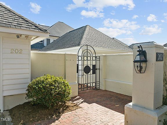 Discover the epitome of classic elegance in this stunning villa located in the prestigious Treyburn community, with serene views from the stone terrace overlooking the 8th tee of the Treyburn golf course. Spanning over 4000 square feet, this exquisite home features both first and second-floor primary bedrooms, ensuring ample space and privacy. A dedicated study provides the perfect environment for work or relaxation, while the landscaped courtyard offers a tranquil oasis for outdoor enjoyment. Unique architectural details include 10'' beaded plank wood siding, a Palladian window and vaulted ceilings, adding a touch of artisanal craftsmanship. The interior is further enhanced by Vega Forge iron work adorning the balcony, an Andrew Preiss custom handrail and a Murano glass chandelier, showcasing the home's unique character and attention to detail. Gourmet enthusiasts will delight in the kitchen's Sub-Zero fridge and warming drawer, perfect for hosting and entertaining. A large laundry room adds to the practicality of this luxurious home, making it a perfect blend of elegance and convenience. For added security and peace of mind, a built-in wall safe is discreetly integrated, ensuring your valuables are well-protected. The home is equipped with an oversized two-car garage with additional attic space, catering to all your storage needs. Sellers are offering a $10,000 update allowance.