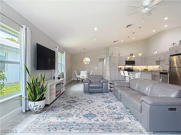 AN EXCELLENT STARTER/RETIREMENT HOME, RENTAL INVESTMENT OR CONVENIENT PLACE FOR A PARENT(S) OR EMPLOYEE. Come see this former Model Home! It's not only gorgeous & well taken care of it is concrete block construction & a seamless galvalume metal roof. This villa is energy efficient with solar roof exhaust fan & skylight. The stove, kitchen pantry, insta-hot water tank & dryer are all natural gas. It also comes with led lighting inside & low voltage accent lighting outside. Storm ready with hurricane impact windows & doors, fiberoptics, underground utilities & each room wired for TV. This home features a spacious open floor plan with cathedral ceiling & island kitchen. There are 2 bedrooms & 2 fully tiled bathrooms plus a laundry/utility closet with gas stack washer & dryer. Your breath will be taken away by the spectacular kitchen with upgraded gray tone cabinets, granite counter tops, island with bar seating, and stainless steel appliances. City Village allows you to relax & enjoy life without the worry of outside lawn or building maintenance—enjoy a “no hassle” lifestyle. City Village is a small community of 18 total homes for a total of 36 villas with easy access to SR 80, shopping and dining.