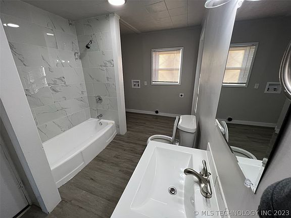 mirror, faucet, shower head, toilet, tub and tile shower surround. Granite kitchen has SS appliances, gas