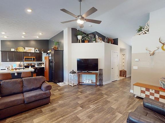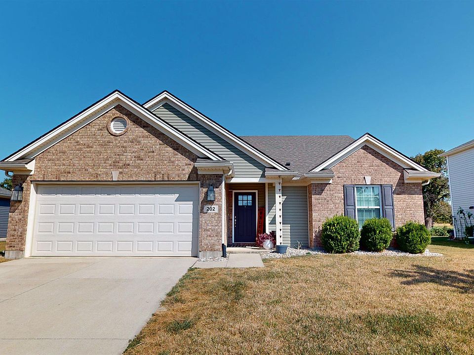 Appealing and Affordable, describes 202 W Stellar Ln. in Huntingburg. This 3 Bedroom, 2 Bath home is sure to please with a charming front porch that welcomes you immediately. The open concept living area has a vaulted ceiling and lots room to spread out and relax. You'll be pleasantly pleased with the fully equipped kitchen and dining area with a great view of the backyard and patio area. The master bedroom offers a private full bathroom with double sink vanity and a very spacious walk-in closet. Additionally, there is a full hallway bathroom and 2 adorable bedrooms with plenty of space and natural lighting. The laundry room lends convenient access to the 2 car garage. Step out back to the concrete patio and you'll find a nice level yard and a handy shed for your tools or toys. Come check out your new home!