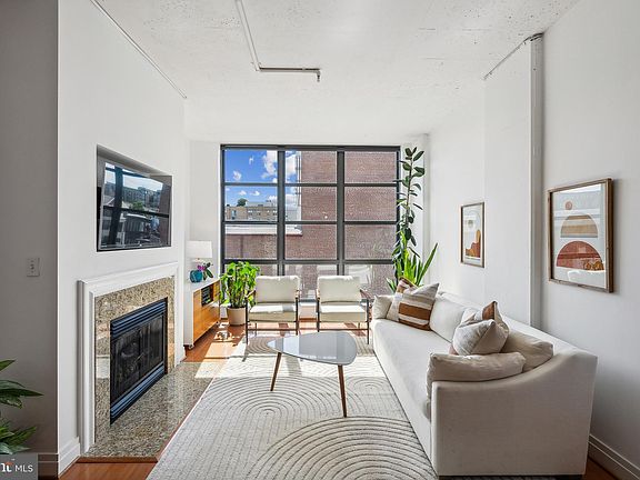 This bright and spacious loft-style unit at 2020 Lofts impresses with its 10-foot ceiling heights, floor-to-ceiling windows, and gas fireplace. The unit has a large living/dining room and a western exposure to enjoy afternoon light and enviable sunsets. Its kitchen features stainless appliances including a gas range, granite counters, and brass hardware on wood shaker cabinets. The bedroom is separated from the living area by a unique, curved wall, and features a large custom closet; its en-suite bathroom includes a tub shower and additional storage from the in-wall shelving. The open area den has been outfitted with built-ins and designer wallpaper and gives access to a powder room for guests. Washer/dryer is in-unit and the HVAC was replaced in 2021. Garage parking conveys. 2020 Lofts is a full-service luxury building with a staffed front desk, on-site property manager, business center, fitness room, and party room. The rooftop has a grilling area, lounge seating, and sweeping views of Washington, D.C. The monthly condo fee includes water, cable TV, and high-speed internet. Live just one block from the U Street Metro (Yellow/Green Lines) as well as a short walk to the Florida Avenue Whole Foods Market and nearby dining and shopping on the 14th Street Corridor.