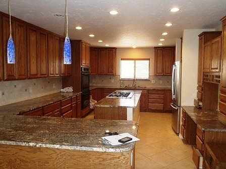 20'x13'6 Gourmet kitchen with 9' island includes 5 burner Kenmore Pro gas cooktop, stainless steel refrigerator with water dispenser and digit display, breakfast nook & Granite slab counters with under mount sink. High end upgrades. Granite throughout, large laundry room with granite counter plus cabinets and ample storage. Huge fenced yard with RV parking and 10'x10' shed. Hand trowelled textured walls with new trim and doors throughout and newly painted 2 tone walls. Guest bath includes jetted tub with custom travertine surround and granite counters finished with new plumbing fixtures and lighting fixtures. Luxurious master suite with large walk-in closet plus a second storage closet with shelving, private master bath with granite counters, all new plumbing & lighting fixtures and HUGE walk in shower with custom travertine, 3 shower heads and built in seat. Newer roof and evap. cooler.