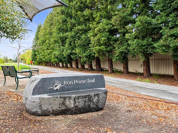 High ceilings and two patios are highlights of this tastefully updated unit, which also includes central AC, a kitchen with granite countertops and stainless appliances, in-unit laundry, stylish flooring, beautiful crown molding, and private garage. Just a stroll away from Iron Horse Trail!