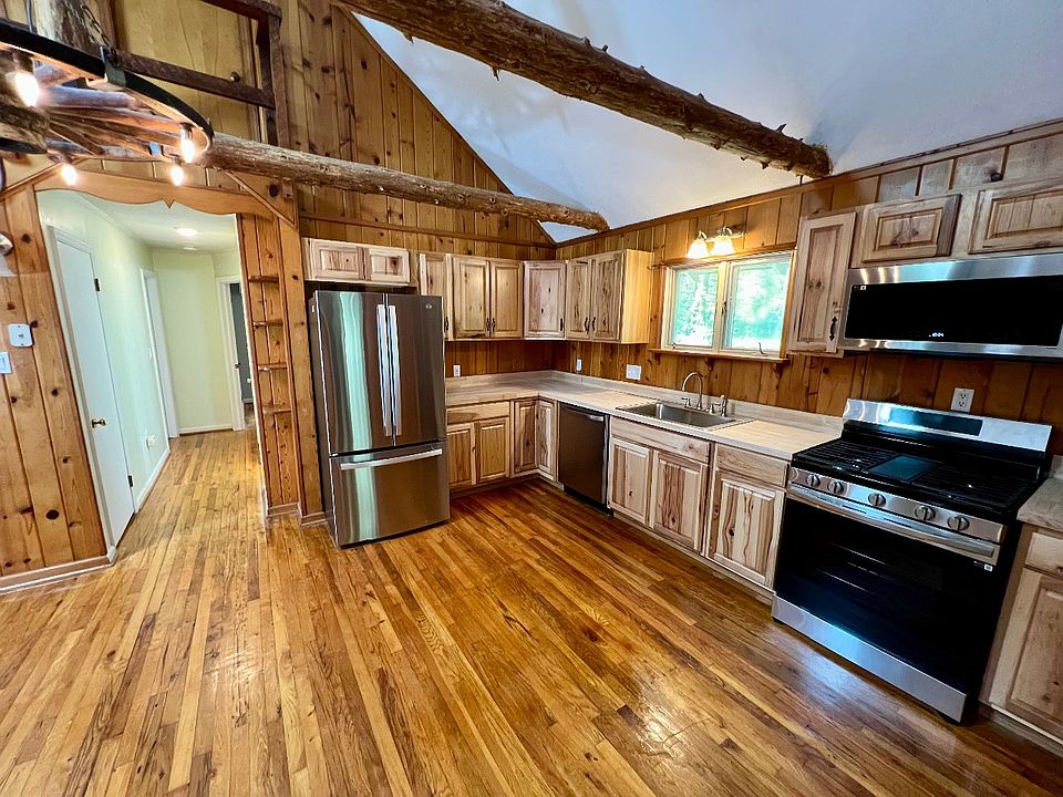 Beautiful farm house on 4 private acres, close proximity to I-64, 5th Street Station/Wegmans shopping center, downtown, Walnut Creek Park and UVA/MJH. New modern kitchen and bath. 2 bedrooms with 3rd bedroom next to 2nd full bath on second level, Home office area on first floor, laundry area, 2 full baths, hardwood floors, Cedar log beams across cathedral ceiling, knotty pine paneling in living room kitchen area, gas fireplace with real stone chimney, 4 ductless HVAC units for heating and cooling efficiency. Fiber internet! Whole house generator! Water, sewer and trash and small storage shed use included at no additional cost to tenant. Grounds maintained by owner. Minimum 12 month term. Ideal candidates will have strong credit score and stable employment history. Water, sewer, trash and lawn care provided