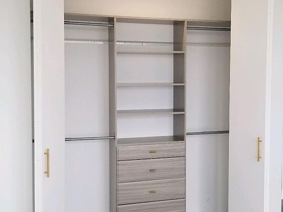 Spacious bedroomWhite quartz countertopsCustom kitchenGold fixturesStainless steel appliancesCustom closets