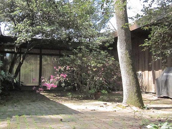 First time on market and this mid-century contemporary design is the perfect floor plan where entertaining rooms and bedrooms are on opposite ends of spacious 3162 sq. ft home with 4 acres(spacious rear yard and a great hill in the back) . Large living room with floor to ceiling windows, hardwood floors, wood-burning fireplace and beamed ceiling. Formal dining with brick feature wall and doors opening onto large deck off dining and living rooms. Kitchen has fairly new appliances, back spash and fab faucet---also a large pantry. A long hall leads to the bedroom areas. The master bedroom is very large with walk-in closet and bath with double sinks. Before turning into another hall to the children's wing, there's another large walk-in closet. This end of L-shaped floor plan has a large game/play room, 3 bedrooms, bath, another large storage closet, laundry and a closet before door that leads into carport. Brick driveway and courtyard. Wooden patio off children's den/playroom. The yard has many beautiful shrubs, trees and flowers in the courtyard and front side yard. This home is a must have for a large family or a smaller family that needs private office spaces, craft rooms and a den/great room that will accommodate a really large tv and lots of seating. Trully a must see.