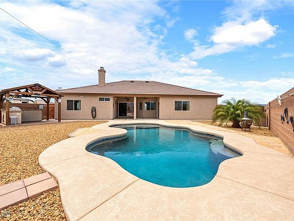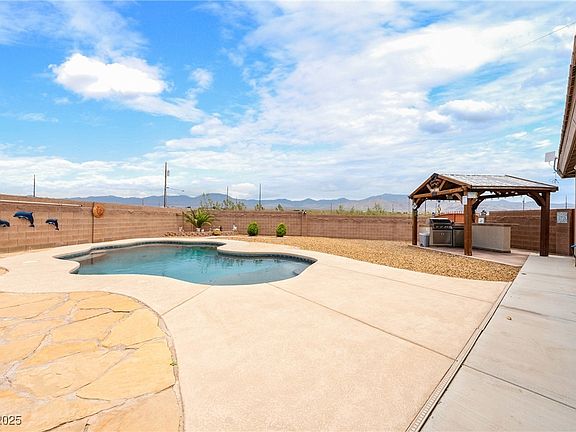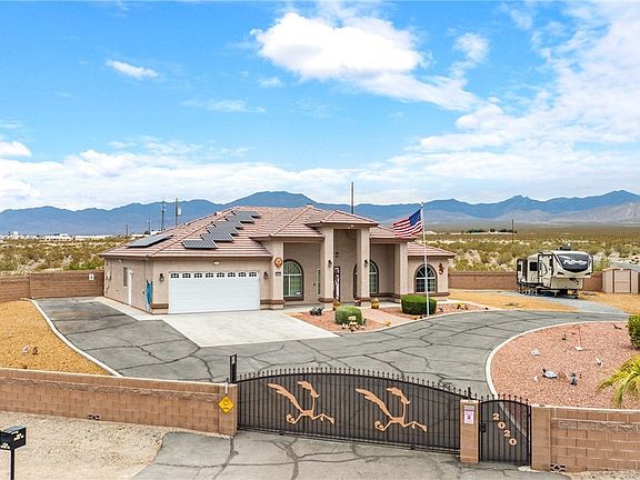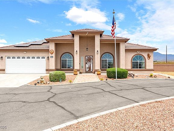 Price Reduced! Welcome to your private desert oasis! This stunning one-story, 3 bed, 3 full bath home offers the perfect blend of comfort, functionality, & outdoor luxury. Enjoy double master suites, each w/ ensuite baths, ideal for multi-gen living or guest privacy. Open/split floorplan, w/ bedrooms on either side of the home for added privacy. Entertain in style with a Pebble Tec inground pool, built-in BBQ outdoor kitchen, covered patio, septic system, & mountain views from your fully fenced, spacious yard. Two RV parking areas w/ full hookups, a circular driveway with custom gates, & an included air compressor in the garage make this a dream for hobbyists & travelers alike. Stay connected with fiber optic internet, & secure with Ring cameras (included). All stainless steel appliances & FULLY PAID OFF solar also included for efficiency & savings. Located just minutes from center of town, yet offering ultimate privacy—this Pahrump gem has it all! Call today for a showing!