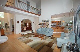 Western exposure. Exquisite waterfront home! Powerful romantic sunsets from luxurious fountained pool area. Radiant sunny move-in condition interior with soaring 10-21 ft. ceilings. Bamboo floors. Magnificent kitchen with granite and cherry wood. Wide open feeling. Master suite downstairs. Study+ Work-Out Room. Bridge-free boating. Dock with lift. Best waterfront value on the Market!