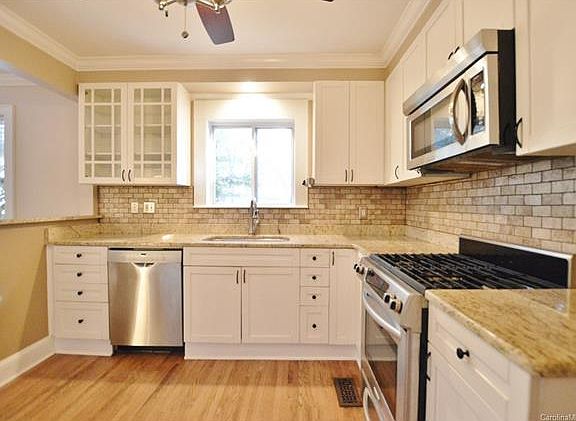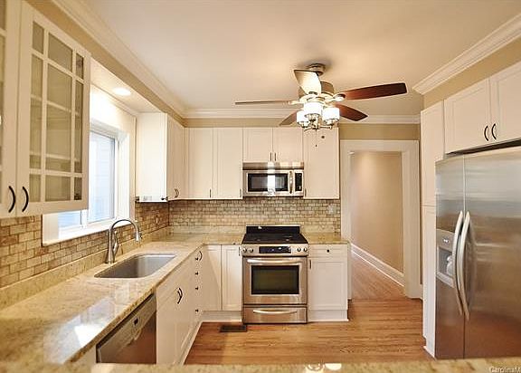 Walk to Plaza Midwood restaurants and retail. Charming Chantilly bungalow with all the upgrades! Rocking chair front porch with ceiling fans. Hardwoods and modern fixtures throughout, fireplace in living room. Gracious dining room opens to modern kitchen with granite, tile backsplash, white cabinets, stainless steel appliances and gas range/oven. Large master suite with custom closet, walk-in shower and granite countertop vanity. Huge laundry room with extra closet space. Private flagstone patio, fenced yard and storage shed.