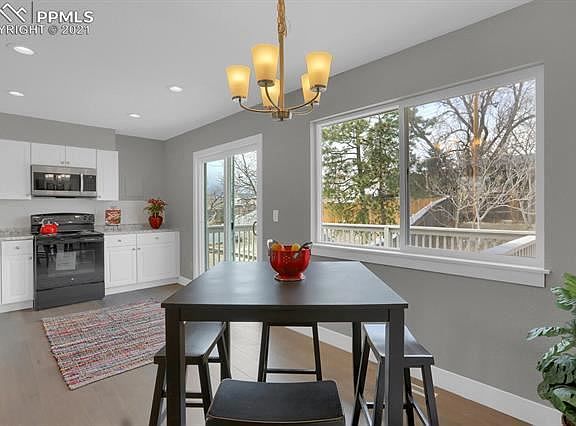 This spacious creampuff with four bedrooms, large 2 car garage, huge back yard, brand new deck with mountain views is simply breathtaking. New paint inside and out, new cabinets, new carpet and wood flooring, metal handrails, new appliances... Manicured easy maintenance front yard is a pride and joy of any homeowner. There is a park across the street to have a picnic. Super convenient location - minutes to I-25, Downtown, Fort Carson, shopping... and so much more.