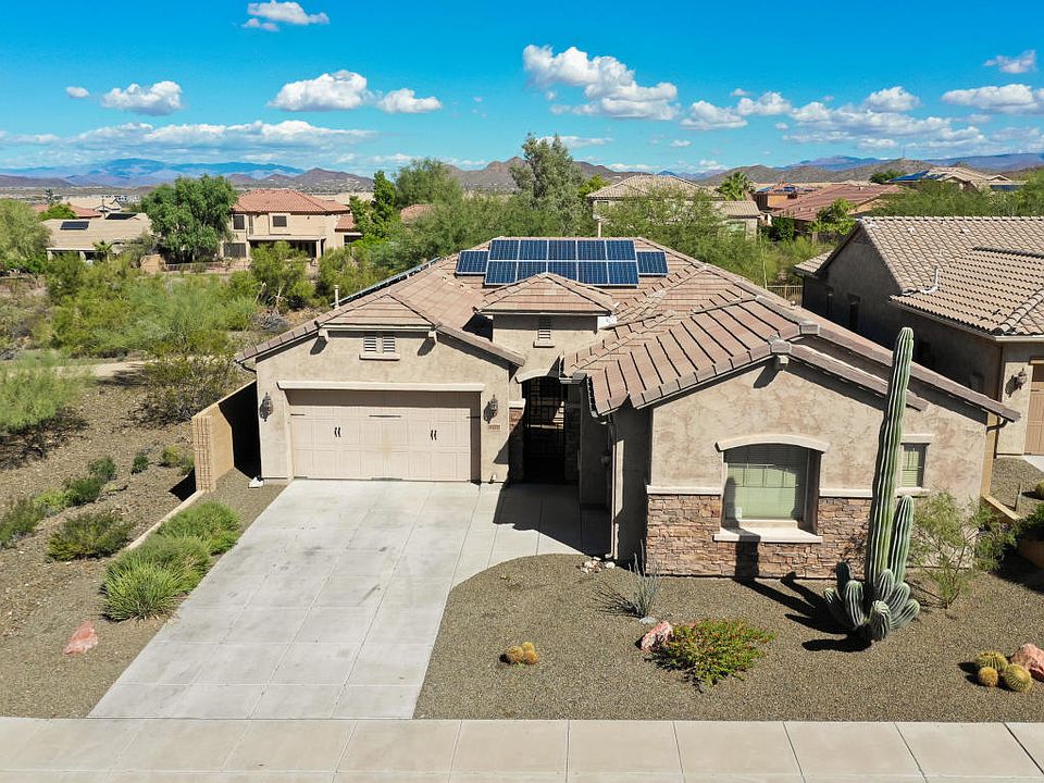 THIS ABSOLUTELY GORGEOUS home in beautiful Dynamite Mountain Ranch in Norterra is located on a premium lot abutting preserve & common area on 2 SIDES! This location offers STUNNING VIEWS and a sense of serenity. The back yard/ patio have view fencing to take in every bit of what natures offers! The spacious floor plan is wonderfully open & perfectly laid out. There are granite counters and beautiful cabinets throughout, stone-like tile floors in most of the home, & attractive stone fireplace in the family room. The master bath with dual vanities, separate tub & shower, & huge master closet are a dream. One of the best features of this home is SOLAR THAT IS OWNED, so no monthly lease payments...just the benefit of low utility bills! This beautiful home offers sooo much!