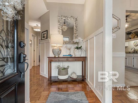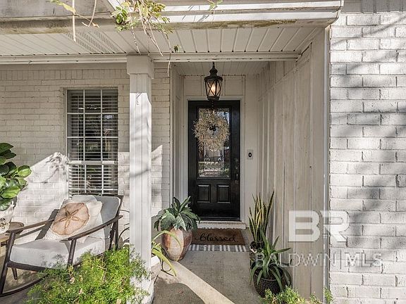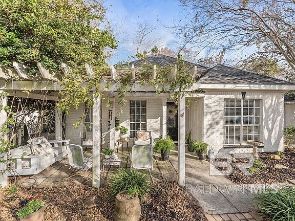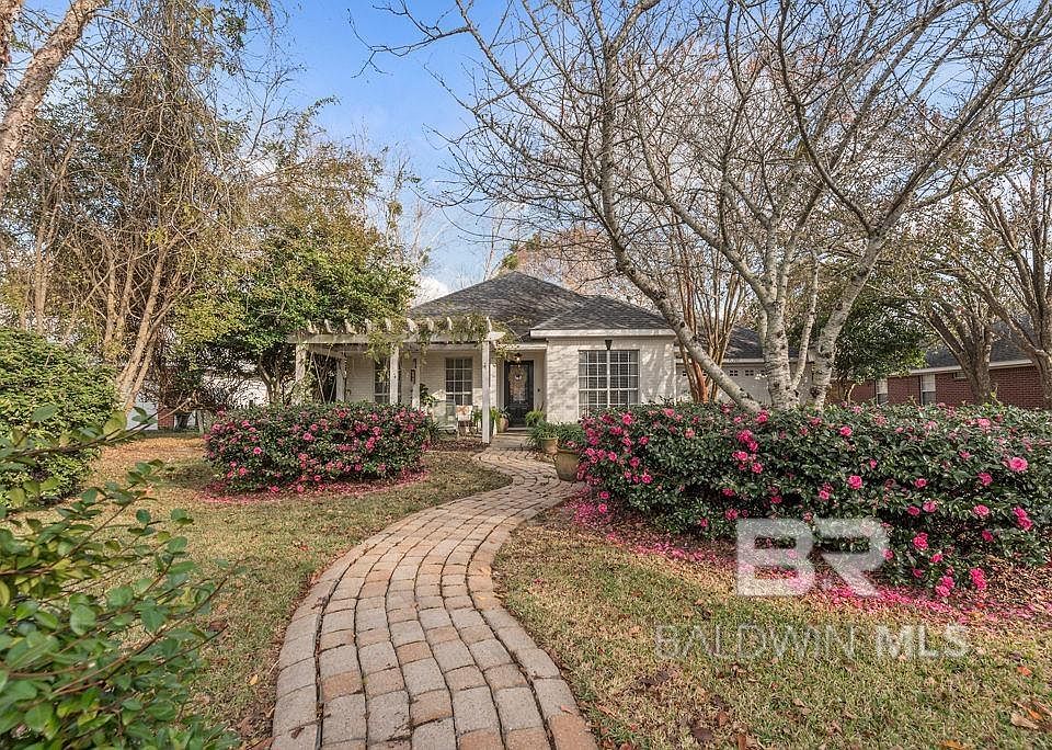 Looking for a charming oasis with the Fairhope touch?! This River Mill house welcomes you with brick walkway and lush landscaping leading up to front patio with pergola and porch swing! The 4 bedroom, 2 bath features an open floor plan with board and batten hall in split bedroom plan that is perfect for entertaining. Kitchen has painted, open glass cabinets with added custom vent hood and tile backsplash. Dining room offers lots of natural light with double window. Living room boasts a gas fireplace with custom tile and mantle and trey ceiling. Large primary suite with trey ceiling and spacious bathroom that includes 2 closets with shelving, double vanity and beautiful, large custom tile shower. Spacious, fenced in backyard is inviting with covered porch, patio, water fountain feature, and shed that does convey. FORTIFIED roof! Established neighborhood just minutes from downtown Fairhope!