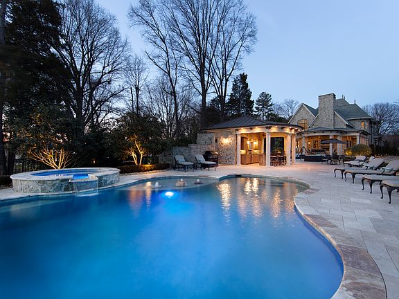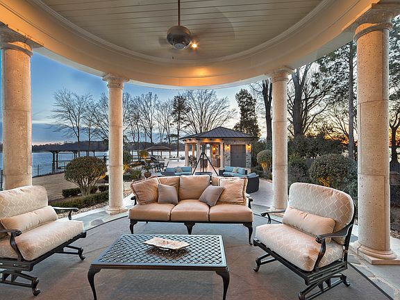 Uncompromising elegance is found in this unique French castle-inspired home located on a private peninsula on Lake Norman. Gated courtyard entrance and tranquil fountain greet you. Floor plan of this beautiful home with its handsome hardwoods and travertine flooring, custom marble and stone accents throughout, grant a view of the lake from almost any room. Enjoy outdoor living year-round under covered patio with fireplace and outdoor kitchen; pool cabana w/bar, saltwater swimming pool, fire-pit by waters edge, pier with boat lift. Magnificently landscaped and includes special garden for vegetables. Here you will find the emphasis is on living the life.