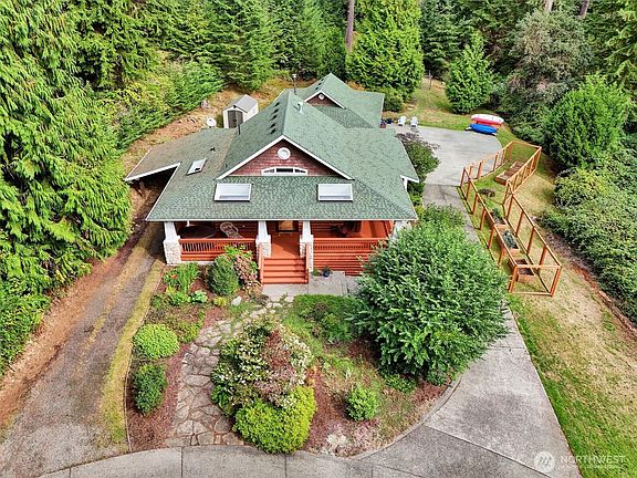 Privately tucked away on 1.5 acres near popular KVI beach, this Ellisport craftsman bungalow has much to offer. Paved driveway leads to the welcoming wraparound covered porch overlooking lovely entry gardens. Cozy living area w/vaulted ceilings & faux river rock fireplace opens to the tastefully remodeled kitchen w/hickory cabinets, artistic custom tile and classic granite countertops. Two bedrooms include primary w/en suite full bath plus 2nd bedroom, 2nd full bath + office/flex room. The detached 528 sq ft building offers comfortable guest space, extra storage & private deck. Surrounded by sylvan beauty, this peaceful serene setting is off the beaten track yet close to schools, town and steps from the best sandy beach on Vashon.