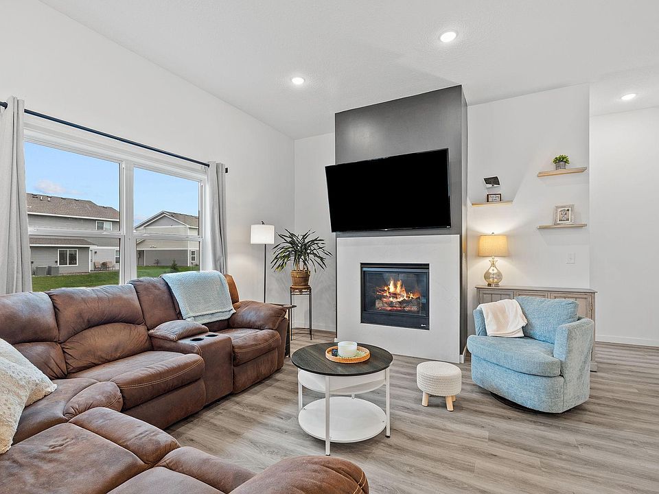 Modern designStylish barn doorInsulated garageHigh-end finishesCozy gas fireplaceOpen-concept main levelNatural light