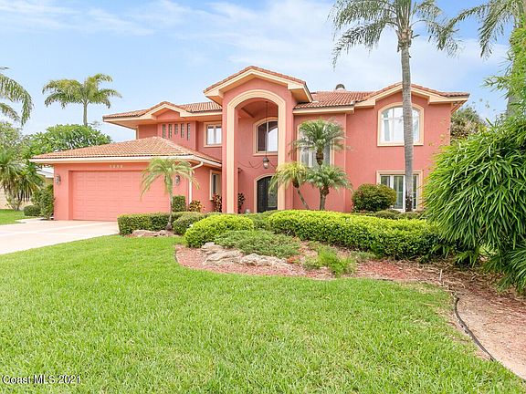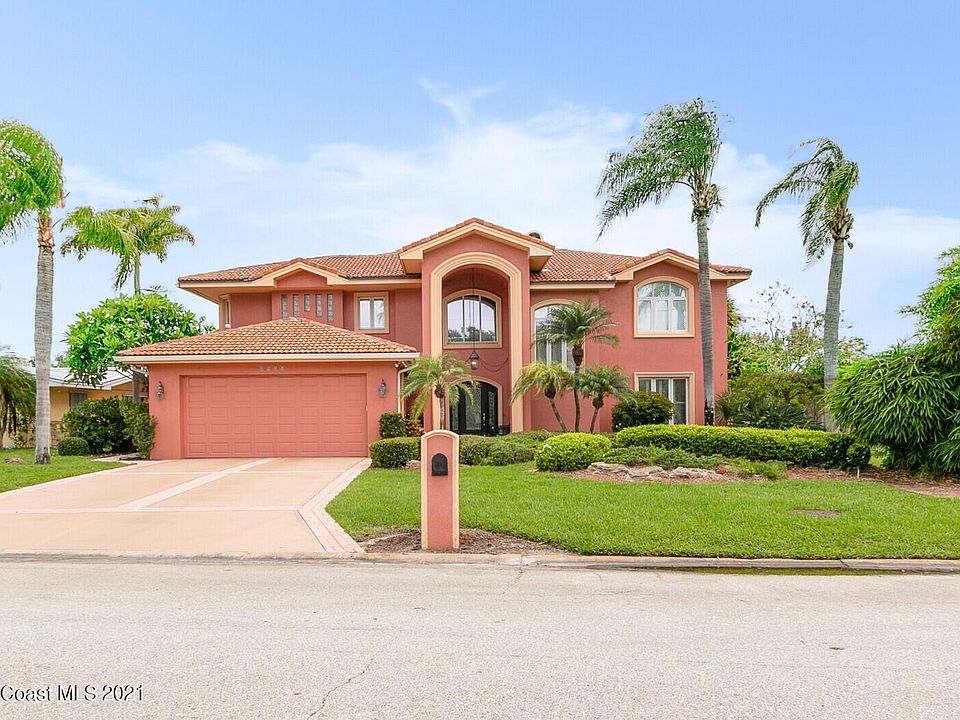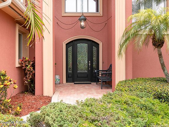 Welcome to the grandeur of 2021 Bali Road in Cocoa Beach. This stunning home has architectural features unlike any other in our area. You will be mesmerized by the expansive river views and soaring 25ft ceiling in the foyer and grand living room. Ascending more than 2 1/2 stories high through the 18x28 living area is a double sided fireplace made of Florida coral stone. The wall of sliding glass doors frame the picturesque river views of the 1000 island preserve, brick paver terrace, riverfront deck and heart shaped pool. This home is located on a deep water channel of the Banana River across from a nature preserve. It provides convenient access to the main branch of the Banana River, the Indian River/Intercoastal Waterway, Port Canaveral and the ocean. Your 16x26 master suite...