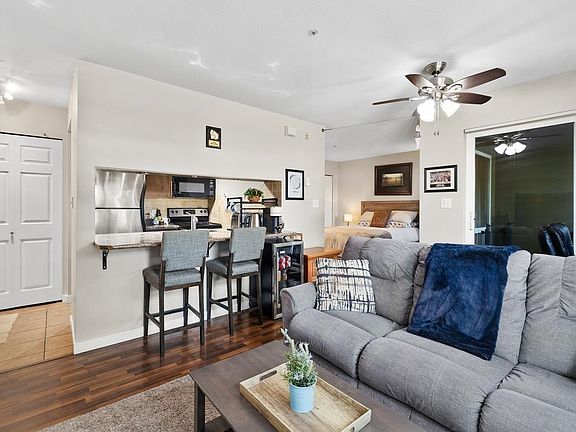Laminate flooringGalley-style kitchenStainless steel appliancesBreakfast barPrivate patio