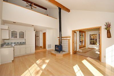 Amazing location - this 6.6 ac property sits at the end of a dead end street and offers complete privacy. There is a year around pond, small orchard, grape vines & raised garden beds. Two decks boasting beautiful tree- top views. The bright and open floor plan features natural Maple wood floors, vaulted ceilings and a large kitchen. The ground level Master Suite has a bathroom and a private staircase leading to a large loft. There is also an additional loft/family room upstairs.