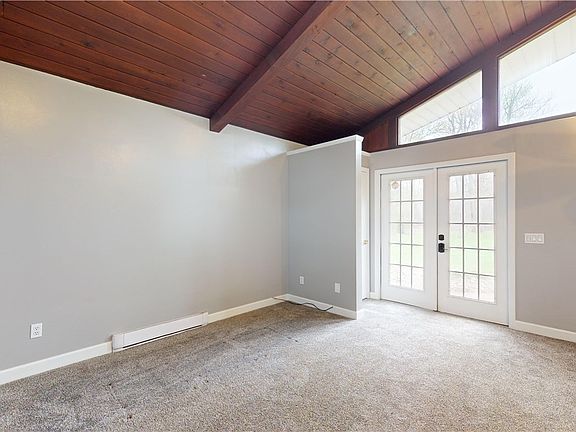 Adorable, updated 2-bedroom Ranch on private 5 acres. Enter the front door to the unique 2-level Living/Dining/Family room combination-you decide how to set it up with multiple options. We included virtually staged pictures as a dining room on upper level and living room on lower level, and as a 2-level living room/sitting/viewing rooms. So many more options for you to pick from as you need. There's a beamed, cathedral ceiling with ceiling fan, track lighting, and front/back rafter windows in addition to the 3 large front windows, anchored by a gas fireplace with remote. All this is open to the eat-in kitchen with white cabinets, Corian counters, all appliances, built-in mini wine/glass rack, newer luxury vinyl flooring, and back door leading to covered patio with wood burning fireplace with cooking grates and a beautiful stone waterfall/fountain. Down the hall is the full bathroom with jetted soaking tub, new granite countertop vanity and newer lights/fan. Next is the laundry room with wall of built-in cupboards, washer and dryer, and ceramic tile floor. At the end of the hallway are the two bedrooms, both with ceiling fans and a combined walk-thru closet that serves both rooms. In back of the house is an oversized, heated 3-car garage with gravelled clearing beside and behind for plans for additional garage that never got built. There is also a shed with a lean-to and a fenced area for a garden. In front of the house is a 9-ft deep stocked pond with dock and lit fountain on a timer. All this on a very private 5 acres where you can hunt or shoot in your own backyard! Updates include carpet 2023, flooring 2021/2022/2023, paint 2023, windows ?2017 (with a couple front ones just replaced 04/24), H2O-50 gal 2015, bathroom 2024, all newer electric baseboard heaters with built-in thermostats 2021-2022, roof 2016, 200 amp electric, garage 100 amp. This is the perfect home for starting out or downsizing if you want lots of privacy! Make your appointment to see it NOW!