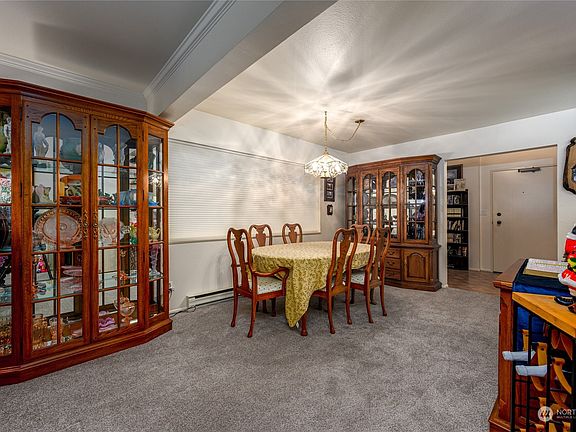 Fantastic two bedroom, two full bath condo with a lovely territorial view and lots of light. This lovely condo has updated kitchen with Corian countertops and tile backsplash. Large living room has marble incased fireplace. All new tinted privacy windows with Hunter Douglas blinds and new carpet. The expansive deck has new top railing and was recently repainted. Separate locked storage area with shelving for your extra items. Covered parking. Secure building with elevator. Great location, easy access to I-5, schools, shopping and restaurants. Monthly dues include water, sewer and garbage.