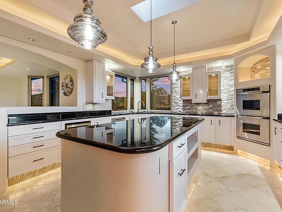 Quality, luxury and elegance in Forest Trails on a private lot with soaring views of Thumb Butte offering a blend of timeless materials, modern amenities, exquisite detail and seamless indoor-outdoor living. Show-stopper man cave with stone wall, dramatic tree and lighting, old-growth Black Walnut bar, custom cabinetry, copper backsplash, rustic vintage doors, wood floors from a 1930s Tucson church, antique mining decor, mine shaft mural, and media viewing area with high-end surround sound system. Main level features open concept living area with curved wall of windows and floating fireplace with French doors flowing to covered and open patios with gas fireplace for four season enjoyment; and gas fireplace; formal dining with hand-painted lighted tray ceiling chefs kitchen with 2 Dacor ovens, 2 Fisher & Paykel dishwashers, 8-burner Viking range with commercial hood and warming lights, Sub-Zero fridge, massive granite slab island and counters all around, storage galore; private office or 4th bedroom; primary suite with luxury bath with jetted Jacuzzi bath framed by columns, large walk-in closet and workout or sitting area; and laundry room. Lower level has family room with kitchenette, large guest room with curved wall, glazed concrete floor and fireplace opening to private patio with new spa tub; second guest bedroom; and full bath. Perfect in-law suite! Peaceful neutral color palette, travertine floors, warm lighting and architectural elements throughout. Oversized three car garage with epoxy floor, separate bay with utility sink, built-in cabinetry and granite countertops for hobby, storage and workshop. Large level driveway. Walk to National Forest trails and community tennis courts. Close to both Dignity Health regional medical centers, public and charter schools, Yavapai College, VA campus, historic downtown Prescott's shops, restaurants and events.