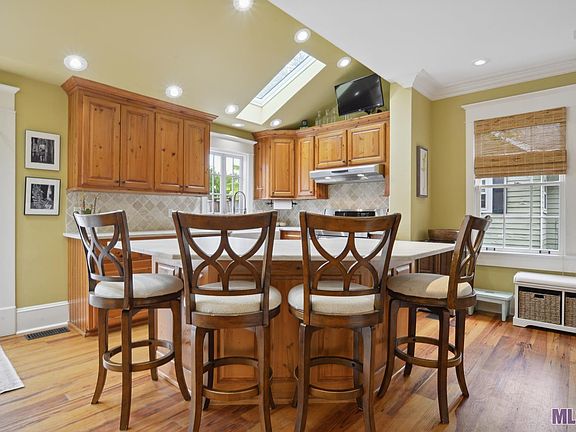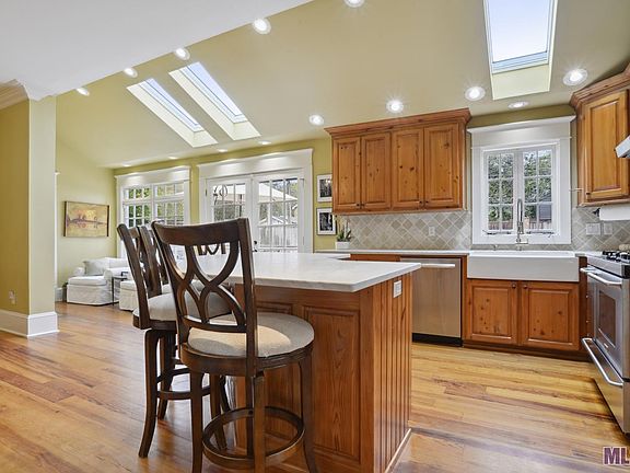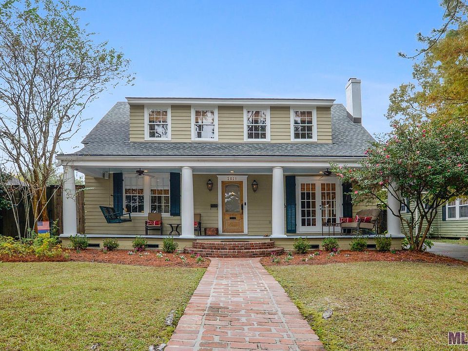 This charming, Dutch Colonial home, built in 1936 has since been renovated back to the studs. Renovations have transformed the home into a modern masterpiece, while still retaining its original character. The house has undergone a complete gut, full rewire and replumb, raised ceiling heights, and a new floor plan that includes a more open layout on the first level. Recent updates include a new roof, skylights, slab countertops throughout, a complete update of the Master bath and closet, intensive restoration to the beautiful wooden double-hung windows, and a refreshed front landscaping. The porch features 4 columns salvaged from a plantation, gas lanterns, exterior speakers, and ceiling fans. The entry and master doors are made of salvaged antique cypress from New Orleans, pair beautifully with the custom pecky cypress cabinets in the kitchen and the cypress mantle, home to the natural gas fireplace of Old St Louis brick. The kitchen has leathered quartzite slab counters, travertine backsplash, new fireclay apron-front sink, stainless appliances, and great natural lighting. Powder room, off kitchen seating area, updated with matte brass fixtures, brick flooring, beadboard paneling, and Phillip Jeffries wallpaper. The spa-like master bath offers a whirlpool tub, multi-head shower, porcelain tile, slab quartz counters, custom framed mirror, double vanities, private water closet, and walk-in closet. Lower-level surround-sound interior and exterior system unifies the inside and outside back deck and expansive backyard, enclosed with 8-foot privacy fence. Upstairs, you'll find 3 spacious bedrooms and a large bath with a jetted tub/shower, slab granite counters, double vanity, skylight, and porcelain tile. Off-street parking, security system, and outdoor video systems for added safety. The center-of-town proximity to LSU, great schools, run/walk paths, parks, museums, numerous attractions, shopping, and St Patrick’s Day Parade passes directly in front of this home.