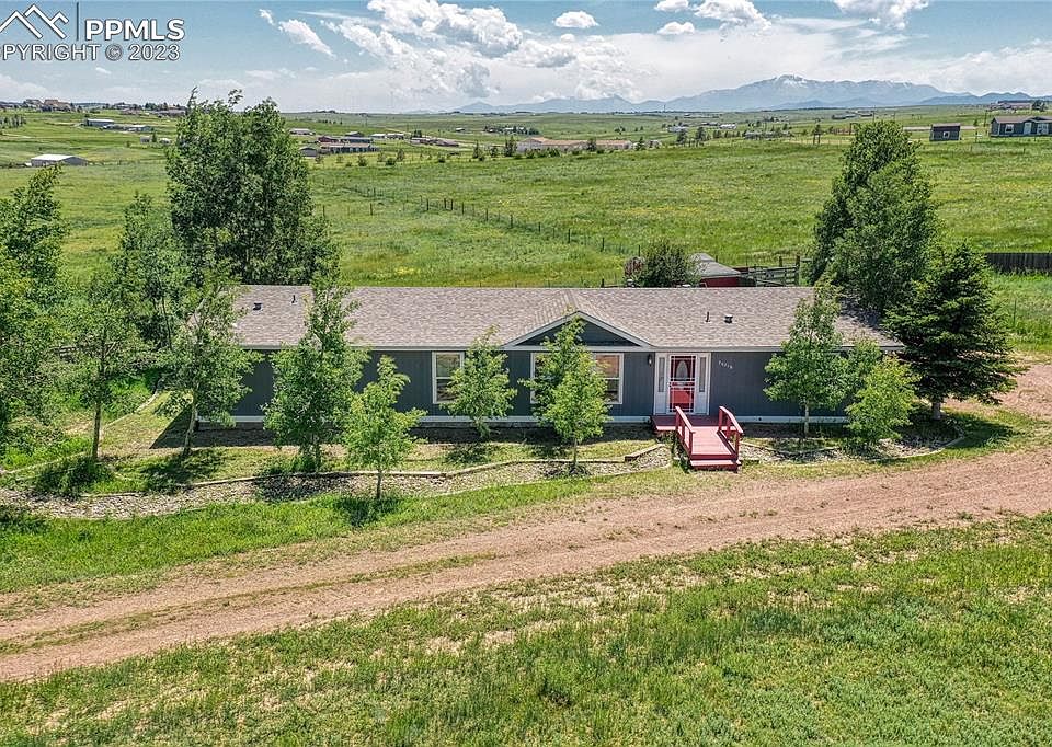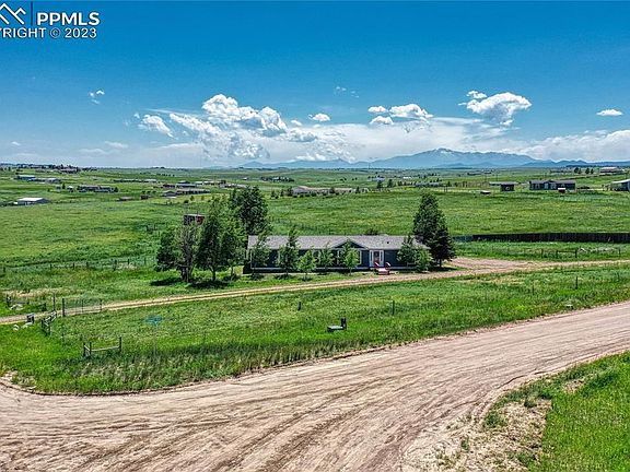 Light and bright rancher with vaulted ceilings sits on 5.58 acres. Fenced pasture, 2 stalls, shed, well water and Pikes Peak views! Open living room plus separate family room. Large master bedroom with attached bathroom and walk-in closet. You can keep animals and enjoy the tranquility and views. The bright open kitchen also looks out to Pikes Peak, has a bar, island and pantry. Get your piece of peace and quiet and sip your coffee on the deck. Sits right on the county line between El Paso county and Douglas county giving you quick access to got to Colorado Spring to the south or Castle Rock or Denver to the north.
