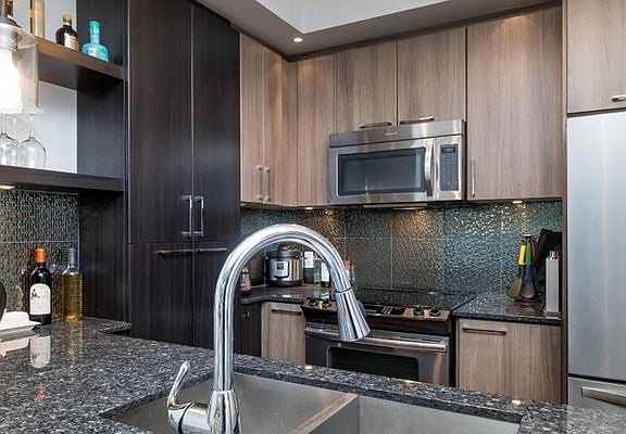 Welcome to this BRIGHT 1 bed & den home at Elements, located in one of the most PRIVATE spots in the complex and backing onto peaceful GREENSPACE. It's in great condition and has a modern kitchen with stainless steel appliances, and a quartz bar counter that opens to the living room with HUGE WINDOWS. There's also a storage locker and 1 parking spot, and great amenities like a fitness center, theatre, and party room. Located just walking steps away from everyday needs such as Costco, Save on Foods + Home Depot. Located across the street from Alexander Square nestled in one of the quietest spots in the building. Live easy in this one bedroom + den ,one bathroom, open floor plan condo. The unit offers granite counter tops throughout, ss appliances,soft closet cupboards & drawers and a private patio overlooking green space. BONUS:Over 9000 sq ft amenities building offering a gym,yoga studio,play center,games room,theater & party room with chefs kitchen. There are also 2 guest suites available. The location is at the center of it all and has commercial units offering a convenient daycare. Water + Heat included Internet/TV/other utilities not included