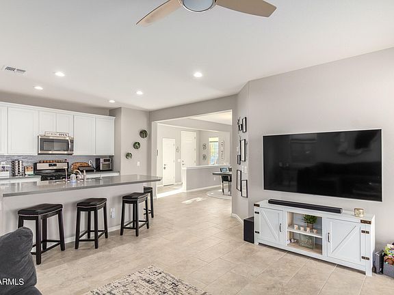 Seller offering $5000 concessions to Buyer for closing costs or interest rate buy-down. Farmhouse perfection in this beautiful, newer (built 2017), single-story home w/perfect color palette & open floorpan in the coveted Blue Horizons neighborhood. Amazing great room w/abundant natural light. Kitchen has huge island w/quartz counters, stainless Whirlpool appliances incl fridge, gas stove/range, R/O, walk-in pantry. Master bedroom is split; beautiful master bath w/dual sinks & quartz counters. N/S orientation, corner lot, no interior steps. Carrier 14-SEER A/C w/programmable Honeywell thermostat. Lovely covered front porch & private backyard w/covered patio. Wonderful community w/playground, walking paths, greenbelt, basketball, sand volleyball & ramada w/bbq. Easy access to shopping incl. 6-8 minutes to Costco, Starbucks, Walmart. Buckeye is one of the fastest-growing cities in the country and boasts strong community spirit with events incl. fireworks, concerts in the park, air shows, & carnivals.