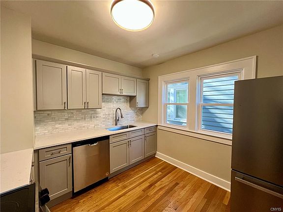 Experience luxurious, modern living in Eastwood. This beautifully renovated 3-bedroom, 1-bath first floor unit, is available immediately. The unit offers one-level living, meticulously updated for an elevated lifestyle. From gleaming hardwood floors to elegant new light fixtures, every detail has been considered. The fully remodeled kitchens feature quartz countertops, high-end stainless steel appliances, tile backsplash & solid wood cabinetry. The unit includes formal dining & spacious living rooms, along with two porches a main porch for relaxation & a private porch off one bedroom for added charm. Bathroom has stylish vanities, tile work, new toilet, and more, creating a fresh feel. The unit includes a washer & dryer in the basement for this unit. There is updated electrical, & new furnaces. This unit feels nearly brand new with luxurious finishes. Located near Syracuse University, Le Moyne College, highways & businesses, this property offers prime accessibility. Make this stunning rental your new home! Owner pays for water/sewer. Looking for a one year lease.