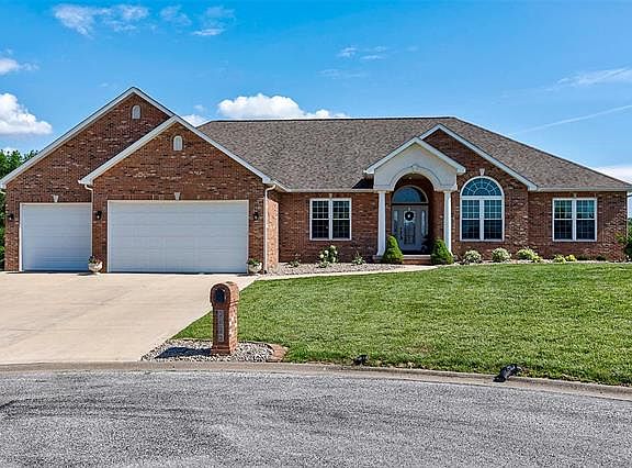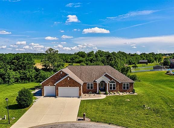 In the Millstadt Manors, a unique neighborhood that allows outbuildings that fit their C&R's, this ranch style home has new landscaping! Enter Your beautiful covered porch & into the foyer w/coat closet. Large living room w/beautiful built-in book case encasing a gas fireplace. Kitchen has a center island w/breakfast bar, pantry, quartz counter tops & appliances included! Formal dining room has glass pocket doors, trey ceiling & plenty of natural sunlight. Bedrooms are spacious w/ample closet space. A full hall bath w/dual vanity. Master bedroom w/dual walk-in closets & trey ceiling. The master bath w/dual vanity, large linen closet, jetted garden tub & separate wet room w/toilet & glass enclosed shower. The laundry room has built-in cabinets, additional hooks & a linen closet. Walkout basement is framed out to include a bar, family room, media room, 2 bedrooms & a bath! An all concrete safe room, which can be used as a wine cellar or storm shelter is located beneath front porch!