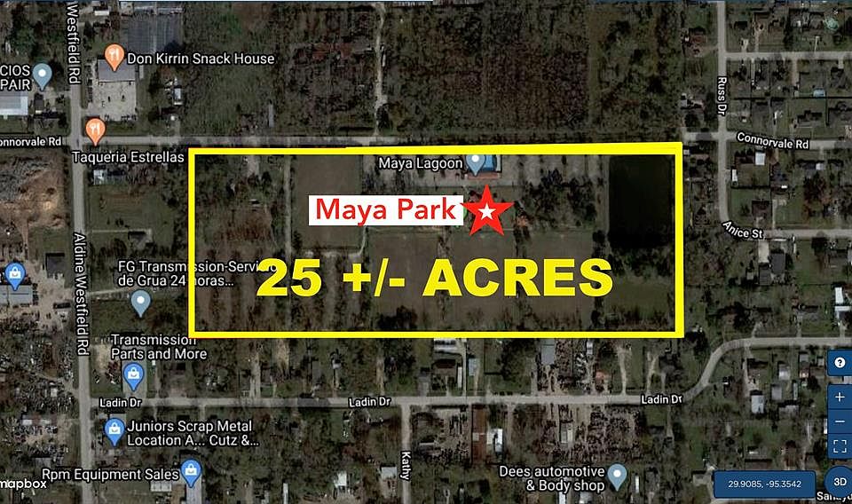 25 Acre Commercial Property For Sale - Currently known as MAYA PARK & MAYA LAGOON! Maya Park is a Soccer Complex - Improvements Include: 4 Soccer fields, 6 Concession stands, 2 sets of menâs & womenâs restrooms, locker rooms w/showers, several covered cabanas, single family residence, 2 story office/storage building & 2nd floor garage apartment used as an employee break area. Site Improvements Include: Stabilized paved concrete for parking - 170 Paid parking spots + additional parking, a large swimming pool, Lighting, Bermuda grass on Fields w/a full irrigation system, commercial grade water well & septic system. The residence is currently utilized as the parkâs office & living quarters for the maintenance workers. Proposed Uses: Commercial, Light Industrial, Mixed Use, Multifamily, Hospitality Center, General Freestanding, Manufactured Homes or a Mobile Home Park. Convenient Access to I-45, Hwy 59, 99 & the Hardy Toll Rd. CALL US FOR MORE INFORMATION OR TO SCHEDULE A PRIVATE TOUR!