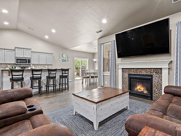 Located smack dab in the middle of one of South Meridian's most sought after communities, you'll be minutes from the freeway, the village and walking distance to Albertsons and several restaurants while having access to miles of walking trails, 5 ponds and 5 playgrounds. Equipped with the most sought after upgrades, quartz counters, hardwood floors, stainless steel appliances, this home has it all. A split level design allows for the perfect balance of privacy and functionality. A wide hallway escorts you to a massive living room with vaulted ceilings and wide open spaces. The kitchen is a chefs dream with quartz countertops, a gas range, a coffee station, and massive walk in pantry. The master suite is stunning with ample space for a king-sized bed and all your belongings. The ensuite boasts dual quartz vanities, soaker tub, walk-in shower and a large walk-in closet. Located on a quarter acre lot w/mature trees, the 40' wide patio is an entertainer's dream with room for your BBQ and hot tub.
