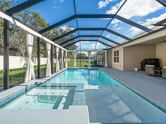 WELCOME HOME! This, better than new, 2yr new, Briella model doesn't disappoint! An entertainer's paradise with an open floorplan, gourmet kitchen, 4 bedrooms, 3 bathrooms, screened in pool w/hot tub and a 3 car garage! Upgrades throughout include wood look tile flooring, updated kitchen cabinets w/gas range & Samsung Flex 4 door fridge, pending lighting pre-wire, custom closets, privacy fabric around pool area, luxury landscape crushed slate, city water/sewer, a/c cooled garage and so much more. Nothing to do accept to move in! Sellers love the neighborhood and are being relocated out of state. Vinyl fences allowed. Looking for buyers who will love this beauty just as much!
