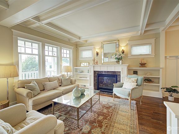Beautiful NW Craftsman home w high end style & detail. A spacious deck in the front is great for gatherings. Formal entry w built in bench leads to living room w box beams, fireplace flanked by bookcases & oak floors extending through the main level. Formal dining room has box beams & wainscoting w plate rail. Kitchen has deluxe 6 burner gas range & large breakfast nook. Open family room is adjacent to the kitchen. Upstairs landing is ideal for a study and access to 3 bedrooms including the primary w walk-in closet, en suite & private deck w Lake View. Full basement has large room wired for surround sound w wet bar, 4th BD & BA, Laundry & Garage Access.  Just 4 houses from Green Lake, cafes, restaurants & shops.