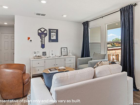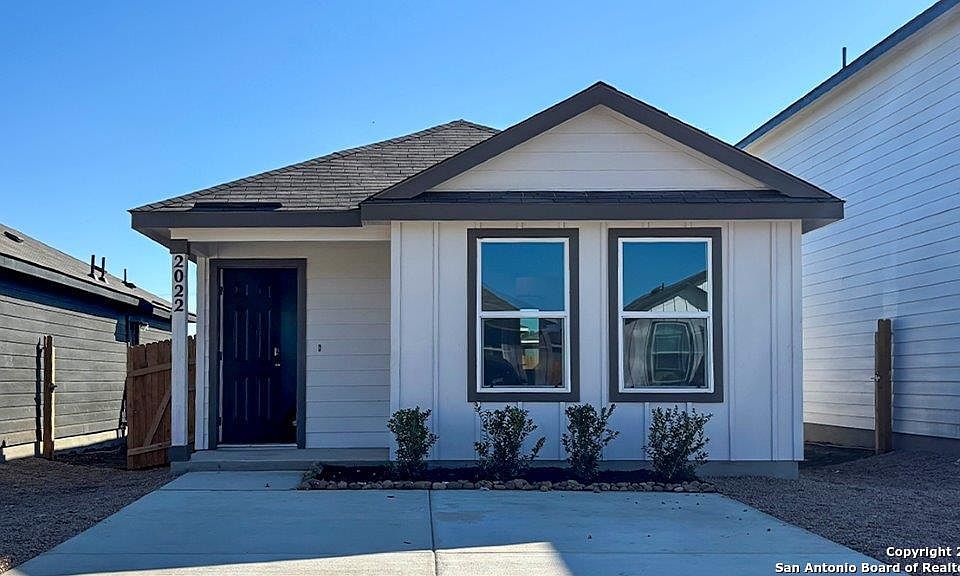 Introducing The Wyeth, a beautiful floor plan featured in the Sonora new construction home community in San Antonio, TX. This thoughtfully designed single-story home offers 1023 square feet of living space, with 3 bedrooms and 2 bathrooms, making it the perfect option for families or those looking. The home's exterior is available in two elevation options, both featuring durable James Hardie siding for long-lasting beauty, for a cozy, yet spacious home. The Wyeth replaces a traditional garage with a driveway, providing convenient parking and easy access. The open and blended layout combines the living room, dining area, and kitchen, creating a seamless space for both everyday living and entertaining. The kitchen is a true highlight, featuring modern shaker-style cabinets, sleek stainless steel appliances, and elegant quartz countertops. A corner pantry provides added storage space, making it easy to keep everything organized and within reach. The main bedroom suite is thoughtfully located toward the front of the house for added privacy and comfort. It includes plush carpet flooring, a walk-in closet, and an ensuite bathroom with a single vanity quartz sink, a walk-in shower, and modern finishes. The secondary bedrooms are spacious and feature carpet flooring, large windows that allow natural light to fill the rooms, and closets for storage. Additional features of The Wyeth include quartz countertops in the secondary bathroom and hard surface flooring throughout the living room, dining area, kitchen, and wet areas, ensuring easy maintenance and a modern aesthetic. With its open concept design, stylish finishes, and well-thought-out layout, The Wyeth is the ideal home for those seeking both comfort and modern living at Sonora in San Antonio, TX.