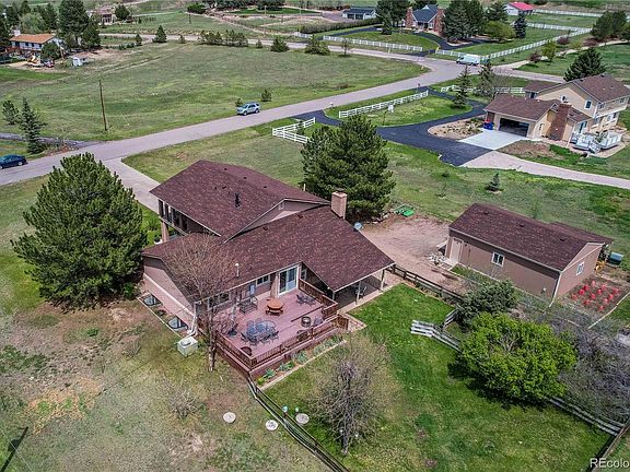 Antelope subdivision is a great place to have land and be close to town. Over 2 acres. On a cul-de-sac with no traffic sounds and located away from Arapahoe Road. On 2.28 acres with 3 outbuildings and 50 amp RV plug. Stucco outside with minimal maintenance and brand new roof just installed. Soaring ceilings on main level and Family room with luxury vinyl wood throughout except carpet in the living room. Updated kitchen with 42" white cabinets, stainless, quartz, pull out shelves and eating space. Newer windows throughout. Covered patio off the family room with huge 2 level Trek deck 18x29 for more entertaining off the eating space from kitchen. Moss rock fireplace with wood stove that can heat most of the house. Covered patio off the family room. Office or bedroom just off the family room. Wet bar in the family room with butcher block counter and quartz. Oversized 2 car attached. Laundry and half bath. Upstairs you will find primary bedroom with 3/4 bath soaring ceilings, ceiling fan, walk in closet and 2 large bedrooms and full bath that is updated. The basement is partially finished with bonus room with egress, another bedroom with an egress window with luxury vinyl planking and furnace room. Huge lot 2.28 acres that allow for horses. Loafing shed, Barn 36x40 4 stall, indoor hay storage, fowling stall, enclosed tack room, Nelson auto watering system. Paddock. Another detached garage or shop 24x32. Tons of riding trails that even extend to Cherry Creek Res, HOA has community riding trails doe miles and is really close is an fenced round pen that is all for the neighborhood to enjoy. Plenty of room for all your toys. HOA says up 1 horse per acre so up to 3 horses on site. Dog run. Well water supplies sprinkler system front and back and the barn. House is connected to city water. Septic system and will be cleaned very soon with results in the supplements.