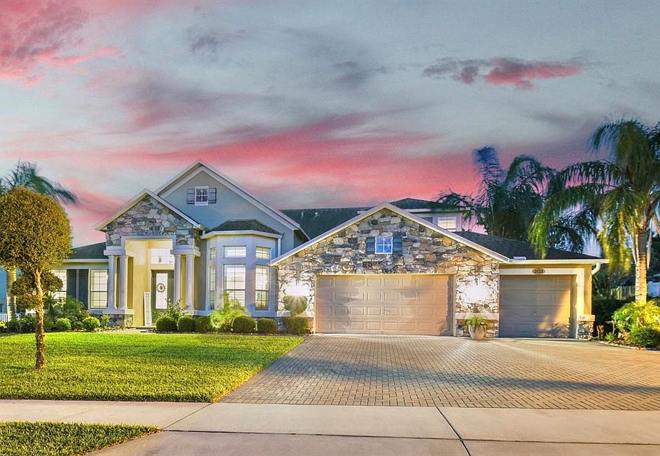 Welcome to the highly sought after gated Wekiva Run community. This exquisite home with amazing lake views is surely going to impress even your pickiest buyers. It is nestled on an oversized premium lot, adorned with lush greenery, mature fruit trees and tall palm trees that provide privacy and a serene atmosphere. As you enter through the majestic glass double door, you're greeted with a bright and open living area full of custom architectural features, large sliding doors overlooking sparkling salt water solar heated pool. The living area showcases 13' tall ceilings, modern fixtures, custom lighting and sleek LVP flooring that flows seamlessly throughout the whole home (installed in 2022). The kitchen is a chef's dream, fully equipped with 42" tall custom cabinetry, stainless steel appliances, built-in double ovens, beautiful granite countertops, an elegant backsplash made of mini brick size pearl shell tiles and plenty of storage space. This entertainer's dream home has two dining areas with one of them adjacent to the kitchen featuring an oversized window that lets in natural light and offers stunning views of the pool and the lake. The owners spared no expense and added many upgrades to their home, including luxury custom window shutters and custom-made floor to ceiling stone electric fireplace that is a centerpiece of the living area. 3 bedrooms including the primary suite are located on the first level. The oversized primary suite features a large bedroom, huge "his and hers" walk-in closets, and a large en-suite bathroom with luxurious soaking tub, walk-in shower, and double vanities. If you work from home, you will appreciate the spacious private office also located on the first floor and customized with decorative illuminated shelving wall. A large bonus room along with another spacious bedroom and a full bathroom awaits for you on the second floor. Second floor also offers a large storage room that is currenty used as a hobby room. The patio, pool area and the backyard offer a true private oasis, with mature fruit and ornamental trees and a fully irrigated vegetable garden. The three car garage is perfect for storing all your vehicles and outdoor equipment, and it includes a custom 240V outlet that will accommodate a level #2 electric vehicle charger. The home is energy efficient with minimal utility bills. Strategically placed less than 40 miles from Disney and the Orlando International Airport, with access to state roads 429, 441 and 414, you are only 15 minutes drive from Mt. Dora and downtown Winter Garden. A "MUST-SEE IN PERSON" to fully appreciate this unique beauty. Don't miss your chance to own this dream home - schedule your private showing today!