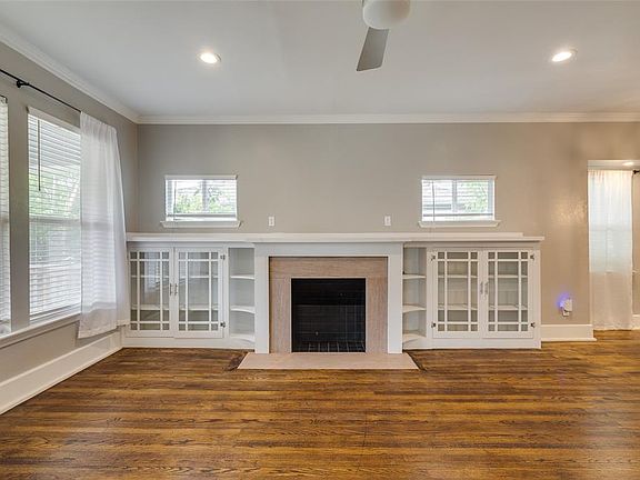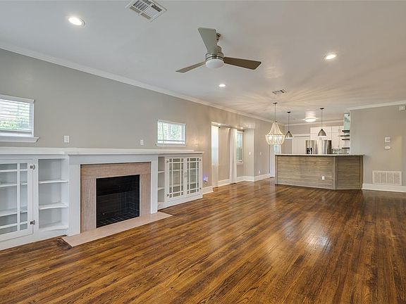 A covered front porch provides a welcoming approach to the home. The main living area features a unique double shotgun floorplan, creating a bright, open space ideal for everyday living and entertaining. Gleaming hardwood floors run throughout the home, highlighting its original charm. A substantial fireplace, flanked by original built-ins, serves as a striking focal point in the living room. Beyond the open living and dining rooms, the renovated kitchen awaits.