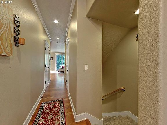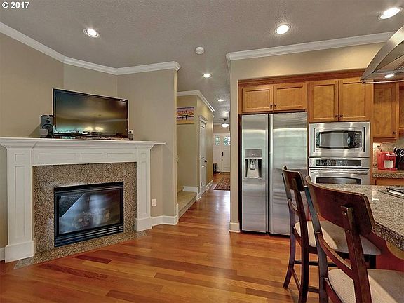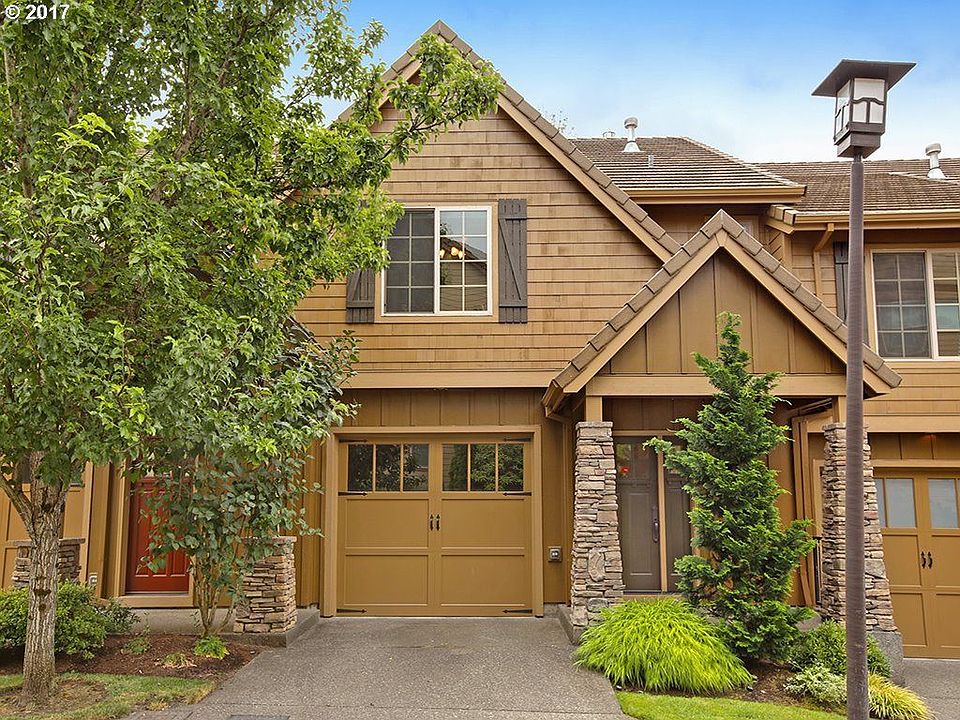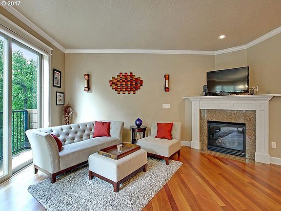 Really charming and larger than it looks! Two bedrooms up. Large master suite w/soaker tub, shower, large walk in closet. Living, dining & kitchen on main. Gas cooking. Tiled counters. Very large family room on lower with patio. 3 Fireplaces! Sliders on main - backs into the greenbelt. Very private.
