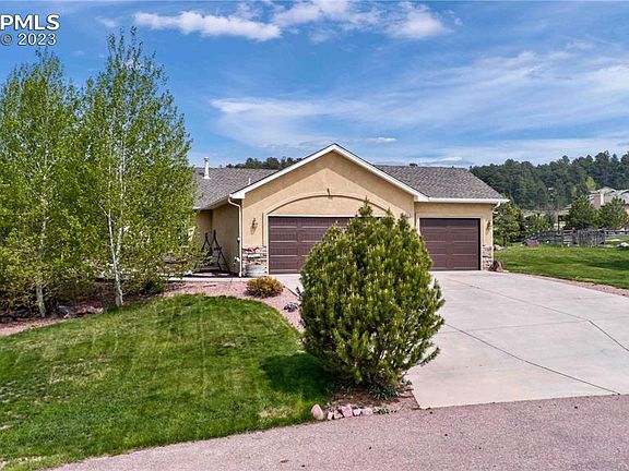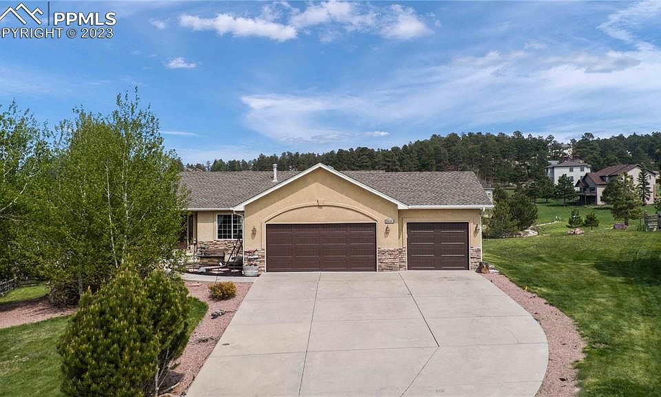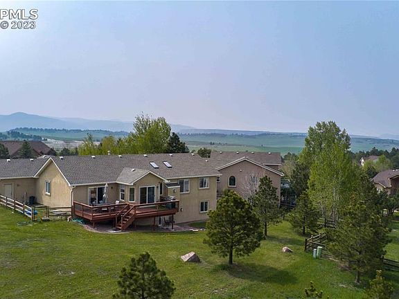 Take in the SPECTACULAR VIEWS of both Bald Mountain and the Front Range from this fabulous ranch home on 1/2 acre lot on a quiet Woodmoor cul de sac. The entrance to the home is landscaped w/ mature trees & stone patio to take in the western mountain views. The living room boasts a vaulted ceiling & plenty of light coming in from the windows flanking the stone fireplace. Enjoy a meal in the formal dining room or in the eat-in kitchen w/walkout to the 27 x 10' deck w/wrought iron railings, wear resistant paint in which to entertain & admire the large backyard w/Bald Mtn as the backdrop. The kitchen has been updated w/level 2 granite, composite sink, SS appliances - including double ovens. The private primary bedroom is tucked away on one end of the home with a luxurious primary bath w/walk-in shower big enough for two, double sinks w/granite tops, and huge walk-in closet. Enjoy your morning coffee on the deck right outside your bedroom door. There are 2 more bedrooms on the main floor flanking another full bath. Or head downstairs to enjoy the awesome family room with lush carpet, a large wet bar, gas fireplace, built in shelves, and walk out to the back yard! An ample 4th bedroom is found at one end while an enormous primary-sized 5th bedroom retreat w/full bath right next door! New 50 gal water heater. This low maintenance stucco home has received many updates over the past couple of years such as vinyl plank flooring on the main floor; new carpet in the basement and bedrooms, new toilets & faucets; & granite countertops throughout the baths. Laundry room on main for your convenience. The ample sized 3 car garage has new doors & a doggie door out to the pen for a private space tucked behind the home. Convenient to everything - the Santa Fe Trail, open spaces, and award winning District 38 schools and Monument is only 2 miles away! Low HOA fee. CCR's are available in listing. This home has been well cared for and is move-in ready!