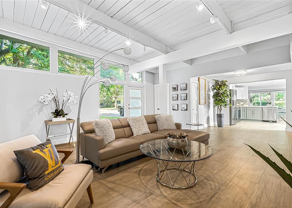 Mid Century Modern Classic 3 bedroom 3 bathroom + loft/office located on a large corner lot in the Heart of Wilton Manors. Property maintains the authenticity of the original Mid Century Design with Stone Front, Vaulted Wood Beam Ceilings & Large Picture Windows while offering a Modern Open Concept Living. Large Picture Window with Double French Doors lead to an Expansive Private Side Porch ideal for relaxation or entertainment. Kitchen features custom solid wood cabinetry, quartz countertops & SS appliances. Huge Primary Suite features a Bay Window with Seat & 2 Primary Walk-In Closets w/Unique Loft/Office space above or 3rd closet. Large Side driveway & extra wide paver front driveway. Substantially Remodeled, New Roof & Impact Windows. Minutes from the best of everything.