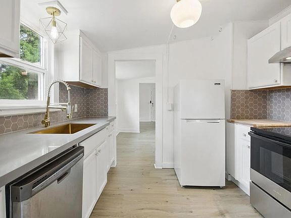 Fully remodeled 3 bed / 1 bath bungalow on a lush, fenced 0.12-acre lot in Portland's vibrant Woodlawn neighborhood. This charming home features wide plank flooring, wall-to-wall carpet in all bedrooms, quartz and butcher block countertops, custom tile work, and updated lighting throughout. Built-ins and a cozy wood-burning fireplace add warmth and character.