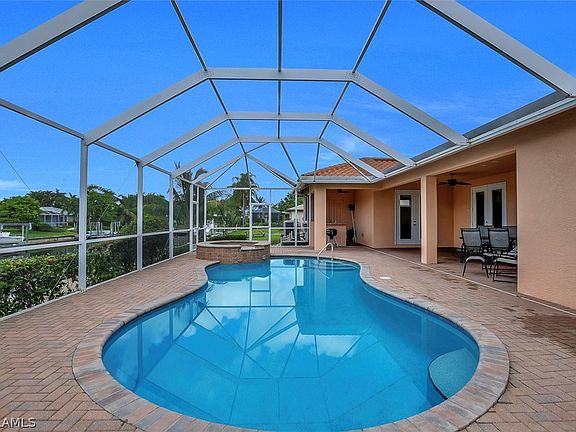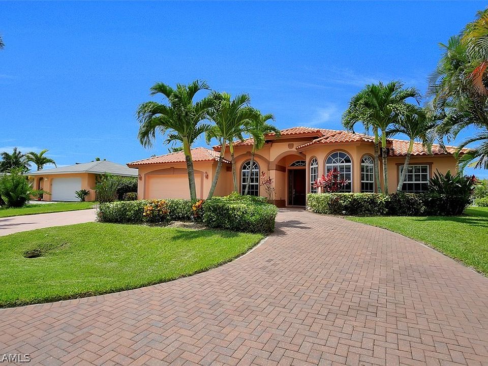 Living the Salt Life, a boater’s dream, this 2006 Spanish Style home is located centrally between the Cape Coral and Fort Myers Entertainment District just off the Caloosahatchee River with quick unfettered Gulf access. With the warm Gulf waters, rivers and mangrove habitat nearby you can fish year-round. This is one of the few places on earth where you can fish saltwater and fresh water in a single day. This area is regaled for its large salt water tarpon and grouper fishing as well as freshwater fishing for snapper, redfish, Snook and trout. This luxurious home has an open floor plan, 14 foot ceilings with 3 BR + Den / Office and 2.5 Baths and 2,488 sq. ft. Top end finishes include granite countertops in kitchen and bathrooms, jetted tub in master, stainless steel appliances, tray ceilings, crown molding, French doors, wooden plantation shutters, barrel tile roof, brick pavers in circular drive as well as surrounding large concrete pool complete with custom spa and outside kitchen. Immaculately landscaped. Rear southern exposure for pool and boat dock. Come enjoy the Salt Life, kayaking, boating, beaches and some of the nation’s top state parks. Watch virtual tour now!