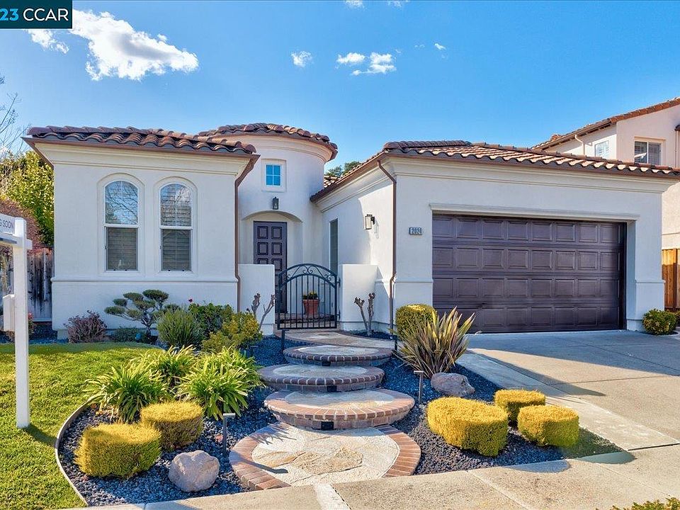 Delightful East-facing, single story home on a quiet corner in the desirable Bridges Golf Course Community. This Rialto model, built by Shapell, offers spacious open rooms, volume ceilings and custom-quality details appreciated by today’s homeowners. Welcoming courtyard entry with Iron Gate and attractive turret foyer. Elegant marble floors throughout main living area. Wonderful eat-in kitchen with stainless steel appliances, walk-in pantry and breakfast nook. Generous primary suite. New flooring and dual sinks in primary ensuite bath. Bedroom 3 currently features custom built-in cabinets and convenient workstation. Enjoy sunsets on your private patio under the custom pergola designed to provide wonderful shade on sunny days. Custom shutters throughout. Large laundry room with sink and convenient cabinets. 2-car garage with storage. Exceptional HOA amenities include clubhouse, pool, tennis, basketball courts. Close to community park, award winning schools, shopping, City Center, Bishop Ranch, 680/580 freeways. Live the Bridges Lifestyle!