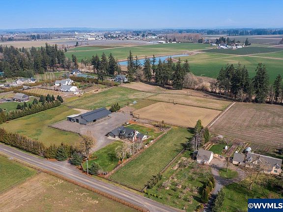 Bucolic Aurora countryside on the edge of Donald,just minutes to I-5 & St Paul Hwy on 10+acres.Charming 3bd,2ba 2,050sf with primary + lrg bonus rm on main.Open kitchen/dining,cozy lvrm fp and hardwoods.Geothermal heat/cool,backup generator,newer roof,150GPM well,covered patio,attach garage.Custom 5stall stables=bells & whistles!Yoked fronts,auto H20,covered runs,wash-rack,hay loft/shavings,finished office/restroom/laundry, impressive tack rm,HUGE 250X300 roping arena.Shop+Covered equip storage!