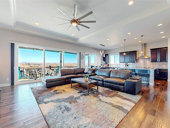 Its all about the breathtaking FULL Front Range Views! This stunning elevated lot 4 bed, 4-bath 3 Car finished garage Ranch home has over 4,000 sq ft with bonus oversized home office space and undeniable stunning finishes is one of the most desired lots on the Ridge! Offering privacy and incredible mountain scenery from Pikes Peak to Downtown Denver for colorful Colorado sunsets on a top level deck or basement walkout level stamped concrete deck with spa like cozy hot tub, fire pit and custom rock seating area. Its the perfect entertainers dream. Owner has invested considerable money in after builder upgrades that set this home apart. Enter inside to find a bright and airy interior, where soaring coffered ceilings and floor to ceiling sliding patio glass doors create a welcoming atmosphere and stunning view to open up back deck to main area. The spacious living room with gas fireplace is perfect for relaxing or entertaining, while open and updated kitchen is a true highlight, featuring sleek granite countertops huge eat in island, stainless steel appliances, a chic waved full backsplash and ample cabinet space & pantry. Main level powder room is convenient for guests or parties. Gleaming hardwood floors beneath your feet cover entire main level. Primary suite provides a private sanctuary with same stunning mountain view, a walk-in closet and an ensuite bathroom featuring dual granite vanities, and huge walk in custom tile shower. Retreat to the other wing of home to a main level office through glass French doors, 2 private bedrooms, main level laundry with utility sink and huge full private bath perfect for guests. Need more room to entertain? Finished walkout basement with 9ft ceilings will make a perfect theater room plumbed for built in bar. Basement bedroom with walk in closet and nearby bathroom is cozy and private. Finished additional flex space room for exercise or reading room, plus a huge unfinished space for more dreams to come true!