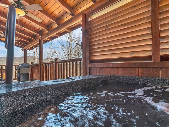 The cabin features two master suites—one on the main floor with a large heart shaped jacuzzi tub, while the one upstairs features two queen beds. Additional amenities include a hot tub, air hockey table, fully stocked kitchen, and convenient parking with easy 1 step up access to the cabin.